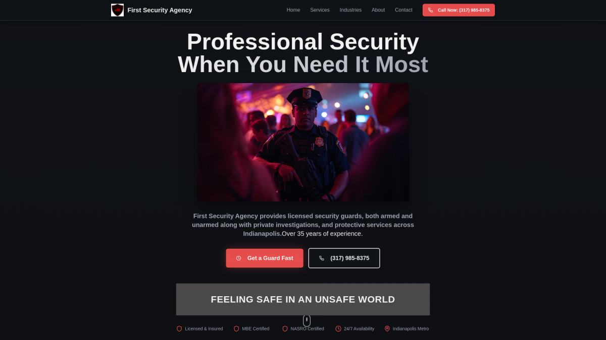 Licensed security guards and private investigation services in Indianapolis. 24/7 emergency response, on-site guards, mobile patrols, event security. ... View